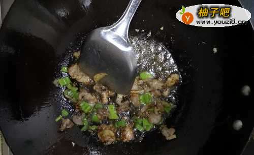 3沥出花椒和八角,将五花肉放入锅中煸炒至微微出油,随后放入葱花和姜翻炒,然后加入豆瓣酱调味。