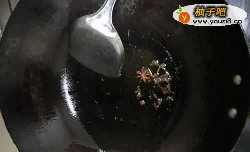 2锅内放适量油,加入花椒和八角爆出香味。