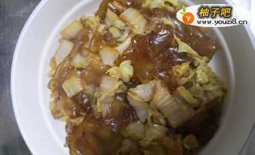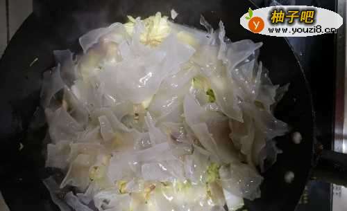 4倒入白菜进行翻炒,将白菜炒至缩水时依次放入耗油、酱油进行调味,翻炒后放入泡好的粉皮。