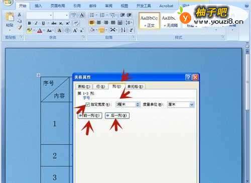 9在“表格属性”中,点击【列】选项,勾选【指定高度】,输入数字,便调整了列的宽度。点击【前一列】、【后一列】,可切换列。