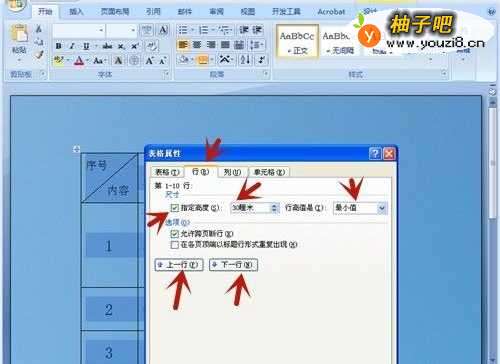 8在“表格属性”中,点击【行】,勾选【指定高度】,输入数字,便调整了行的高度。点击【前一行】、【后一行】,可切换行。