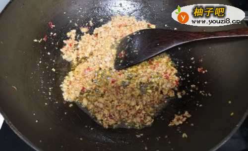 4炒匀酱料后,加入猪肉末。
