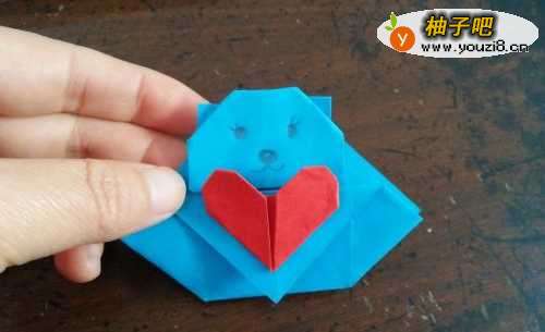 6再把两侧的角回位,把顶上的两个角向两边折。把外边的角都向内折,然后用胶水把心形粘在小熊的身上即可。