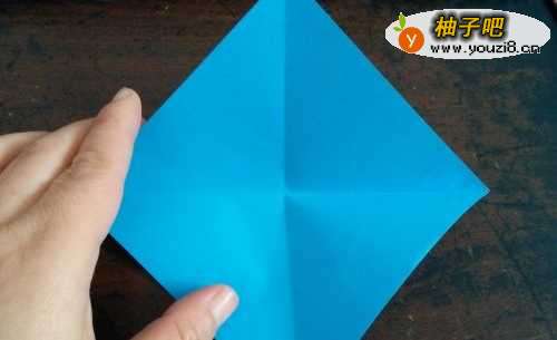 先把彩纸的两角对折,打开后再把上下两角向内折,然后翻到背面,把边向内折,如图三。