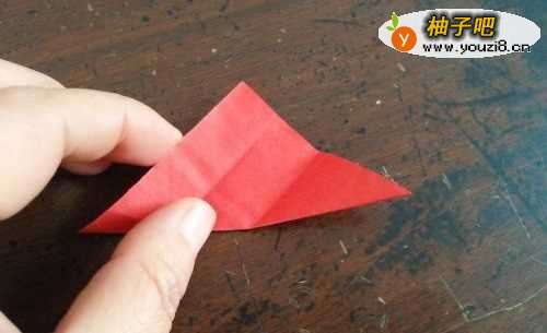 4翻到背面,把角向内折,再向外折,如图一。然后我们再把另一张彩纸两角对折,如图三。