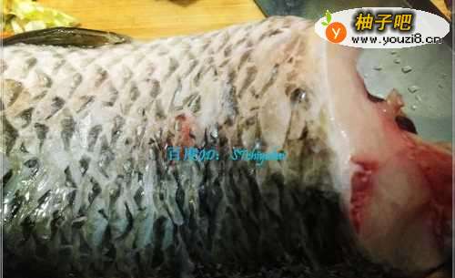 2准备一条草鱼,让卖鱼师傅帮忙处理一下,我这里用的是冰冻的草鱼,拿出来退冰,然后将其切成草鱼块。
