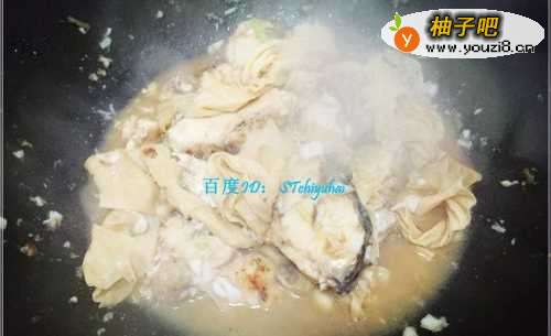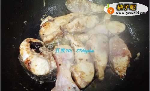 5煎草鱼块的时候要注意翻转草鱼块,不要单一边煎,不然容易焦掉,待两边都变色之后加入腐竹,翻炒一会。