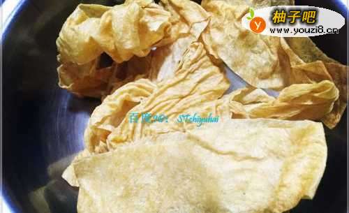 准备一些腐竹干,将其放入碗中,加入少许水发泡一下,然后过水清洗几遍,放在边上备用。
