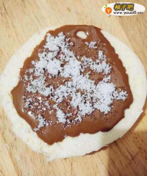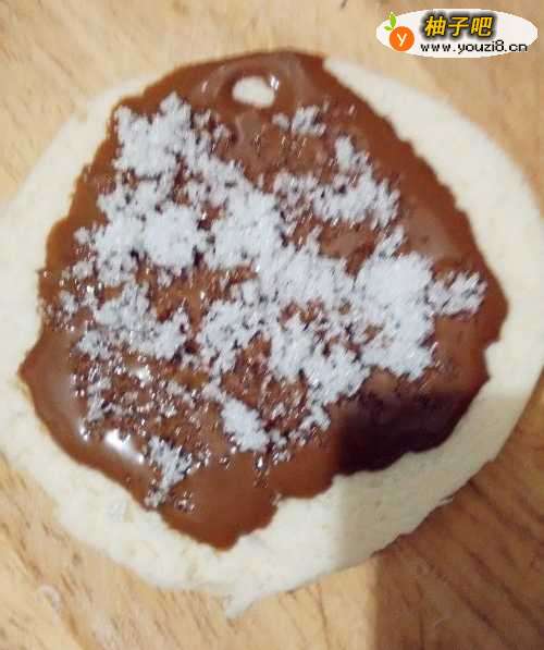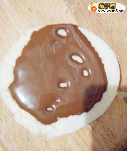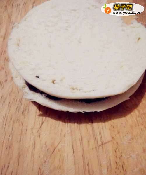6把第二片馒头片盖在白糖上面,双层馒头片夹着芝麻酱和白糖,吃起来真香。