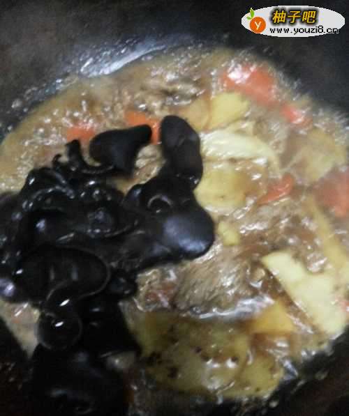 6倒入少许水,放上发好的木耳,盖上锅盖炖一会。