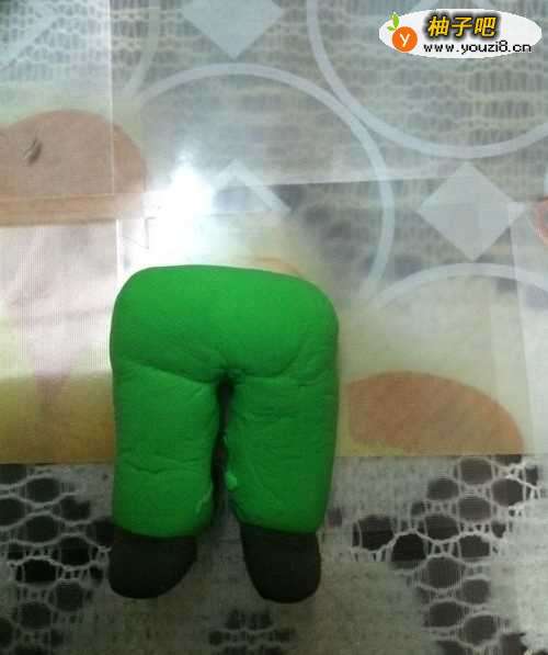 4第四步就是做小男孩的腿,用绿色的粘土很容易就捏成长方快。中间用工具切开然后在进行细节调整。脚上用另外一种颜色捏出鞋子的形状,然后黏在腿上即可。因为材料的原因,我用的粘土很容易打皱。