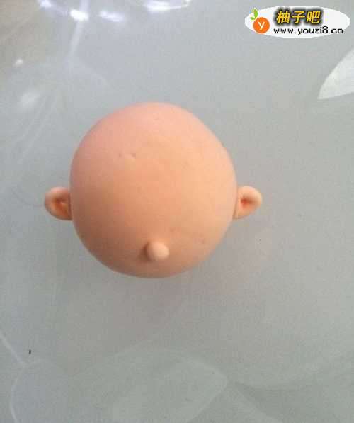 第一步先将用粘土搓成一个球形作为小男孩的头,然后捏两个小耳朵,和一个鼻子沾上即可。耳朵可借用有尖头的工具捣一下即可就可以有耳蜗。