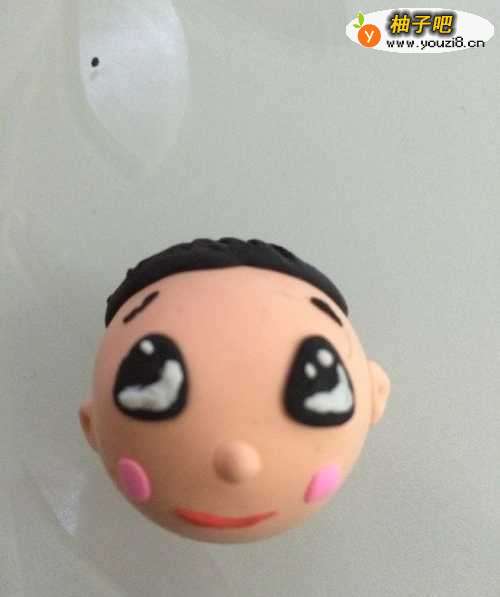 3第三步用黑色的粘土做出头发。先将黑色的泥搓成一个球,然后压扁,然后粘在头顶。用工具在头发上画出条状的印记像头发的纹路。这样我们的头部就完成了。