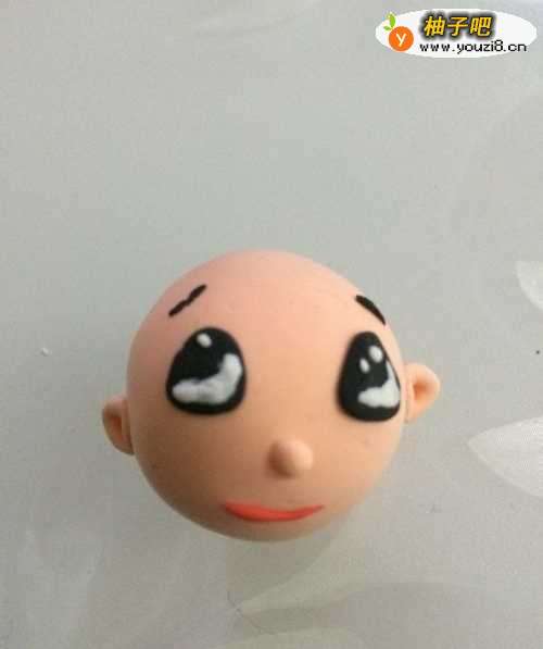 2第二步用泥做出眼睛,嘴巴和眉毛。眉毛和嘴巴就是用泥搓成一条线然后粘上就可以了。眼睛先做底部的黑色。然后最拿少量白色粘土做出眼白形状粘上。眼睛可以自己改变眼白位置这样眼神就会不一样的效果。