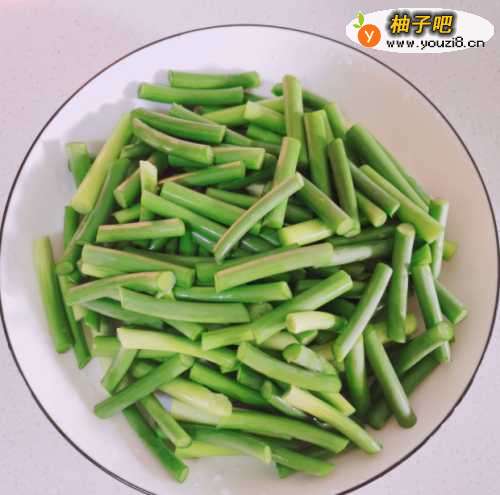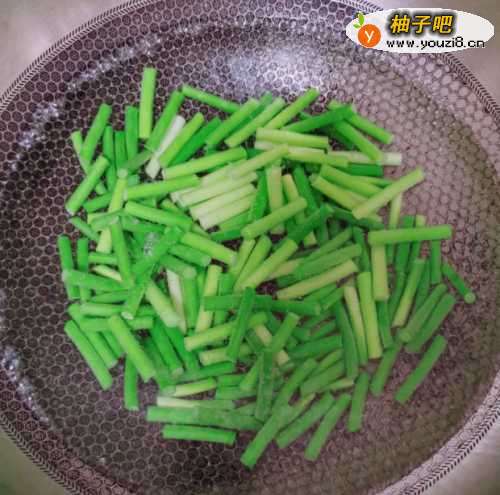 2这时候,往锅里注入适量清水煮开,然后倒入蒜苔焯2分钟捞出备用