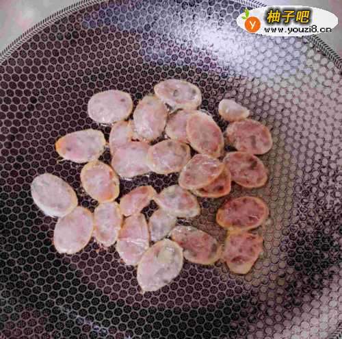 3接下来,起锅热油,放入香肠小火煎至透明,然后捞出备用;