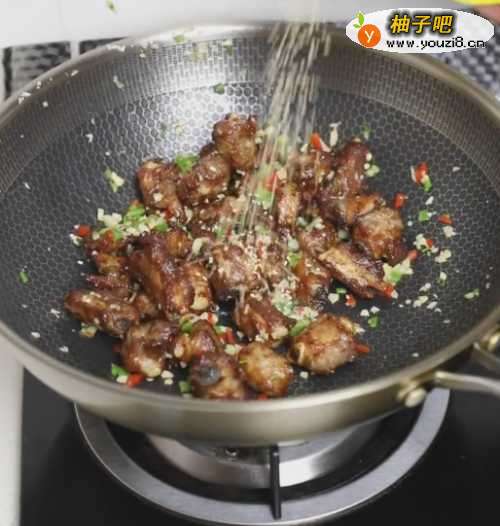 8倒入排骨,放入适量的白芝麻,翻炒均匀。