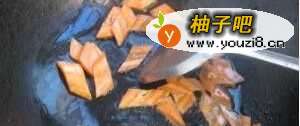 9锅中放底油,放胡萝卜片煸炒
