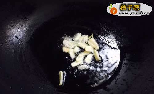 3锅烧热,加入少许油,油温至9成热的时候放入蒜瓣煸香。