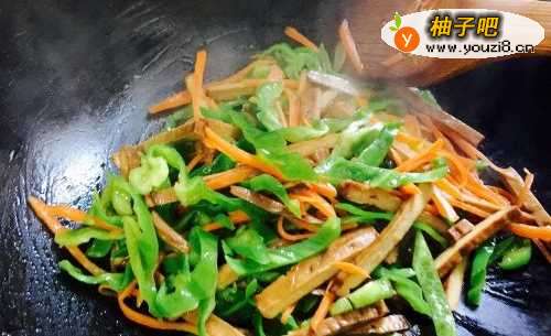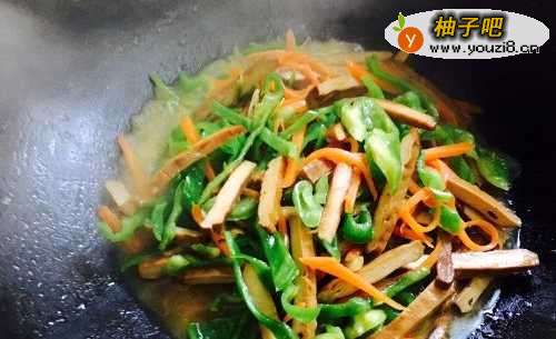 6在翻炒过程中可以加入少量水,让青椒胡萝卜香干不会太干。