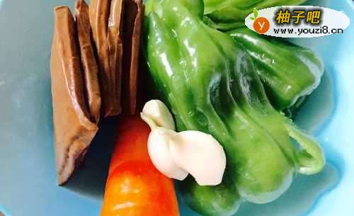 首先将青椒去蒂去籽,胡萝卜去皮,蒜瓣去皮,香干洗净沥干水分备用。