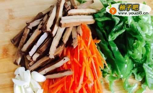 2接着将青椒、胡萝卜、香干全部切成丝,蒜瓣切成片备用。