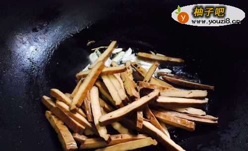 4接着将香干放进去翻炒30秒。