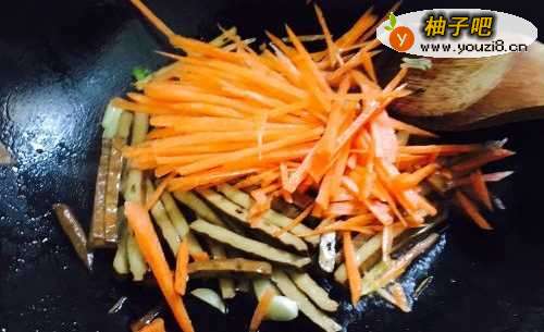 5之后依次放入胡萝卜丝和青椒丝,开大火翻炒1分钟左右即可。