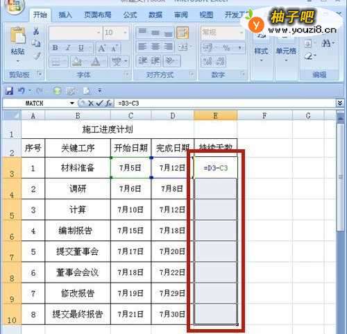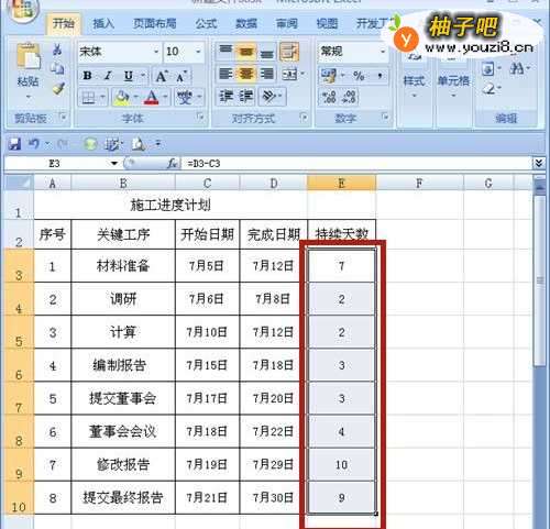 3计算持续天数,选中E3至E10单元格,在E3单元格内输入公式【=D3-C3】。