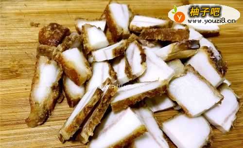 首先把炸过的扣肉切成片备用。