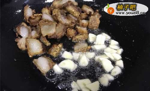 5煎过扣肉的油比较多的,先倒一点出来留着炒青菜,然后把蒜片放进锅里炒出香味。