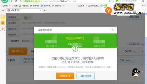 11选择好需要的车票类型。然后提示立即支付和稍后支付。只要在45分钟之内支付完毕,票就是你的了。