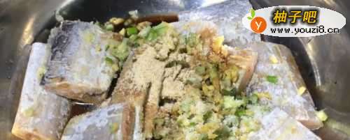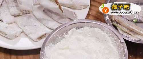 4把腌制好的带鱼放在面粉糊里搅拌,然后再裹上一层淀粉。因为这样炸出来的带鱼酥脆不粘锅。