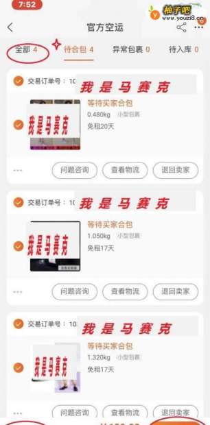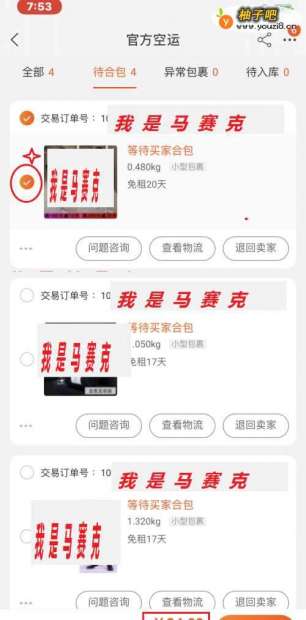 5接下来就进入空运待合包的页面。在此将要一起运到国外的订单全部选中。