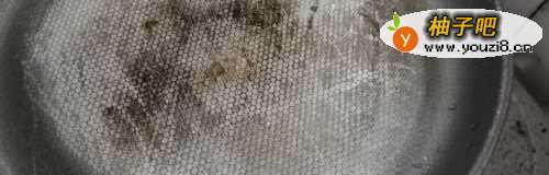 5接下来开始预热锅底煎蛋,用平底锅哦,倒入适量的油,把蛋液分几次倒入锅里,小火慢慢煎熟(不用翻)。