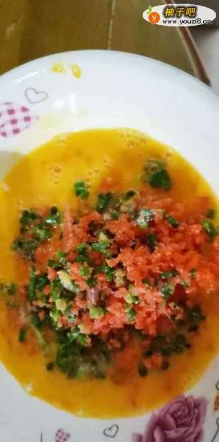 4再把胡萝卜馅、葱花等一起放入蛋液中,加入适量的盐,两三滴生抽,搅拌均匀即可。