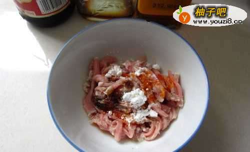 把切好的瘦肉丝用酱油,醋,盐,生粉腌制十分钟.