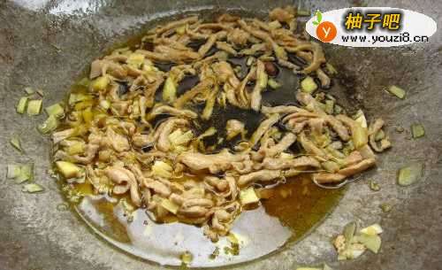 4放入腌制好的瘦肉丝翻炒至六分熟.