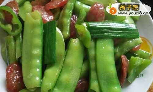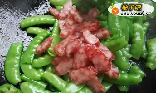 5至荷兰豆变色加入腊肠继续翻炒