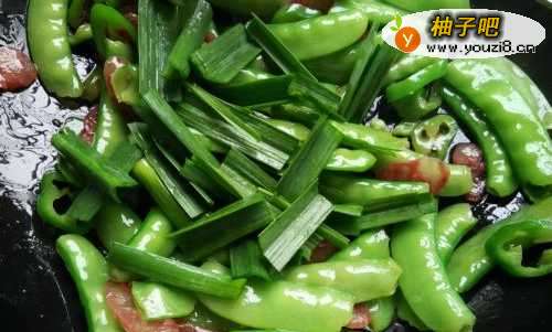 6要熟的时候加入蒜苗尾继续翻炒1、2分钟