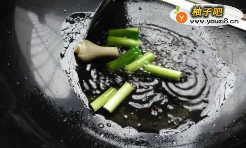 3锅里下油烧热,下入蒜苗头炒出香味来