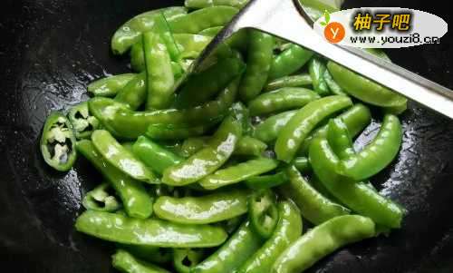 4将洗好的荷兰豆和尖椒倒入锅里翻炒几分钟