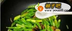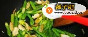 10放入芦笋翻炒,加一两勺的鲍鱼汁调料(没有可不加),少量生抽,1茶匙白糖,翻炒均匀