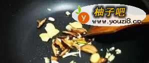9锅内放油烧热,放入干香菇片,同时下 葱、姜、蒜 煸出香味;