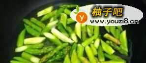 8将芦笋倒入沸水中快速焯一遍,时间不宜过长,装起沥干水分备用;