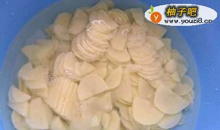 2然后把去了皮的土豆,切成片状,泡在水中,目的是去除一定量的淀粉。