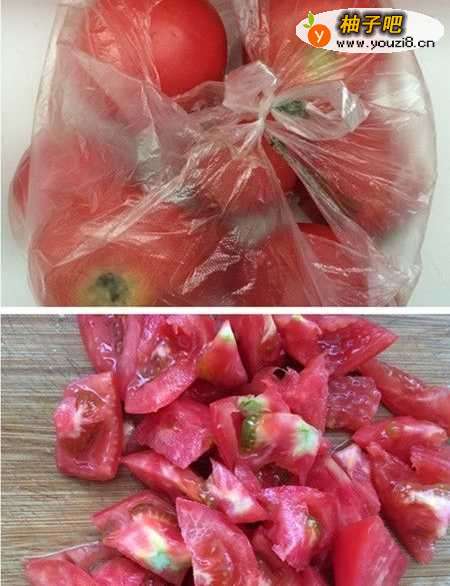 3番茄,也就是西红柿,洗净后,切成不规则的菱形,盛盘备用。