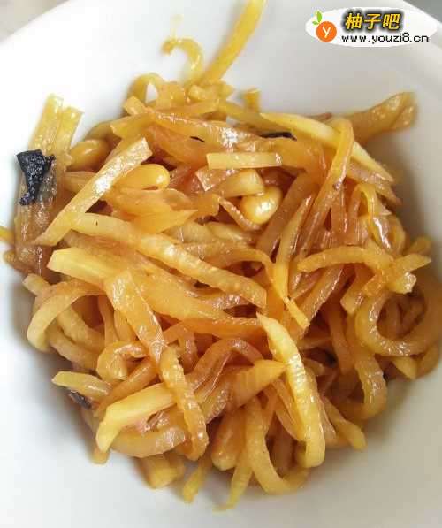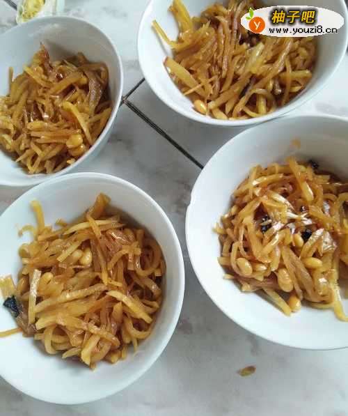 11等旱萝卜炒熟,黄豆也炒熟后,就可以出锅了,虽然菜比较简单,但辣辣的,很好吃。