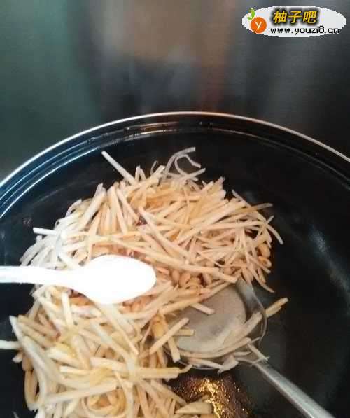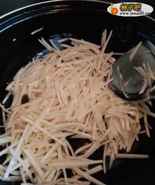 5将旱萝卜丝倒入锅中,用铲子来回翻炒。