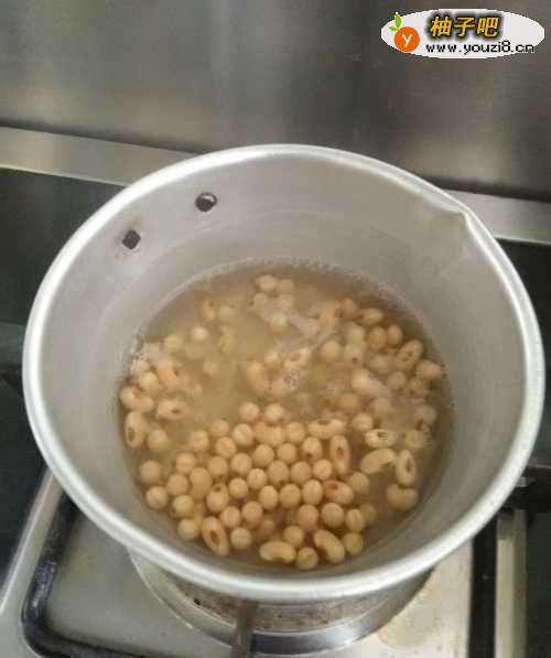 3在小锅中放入清水,水热后,先将黄豆煮熟。